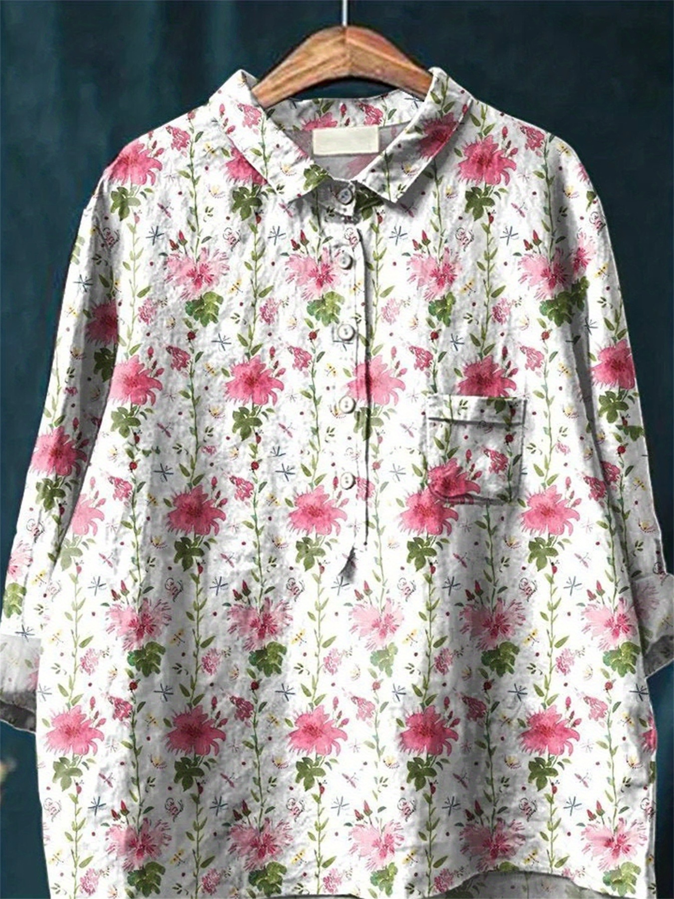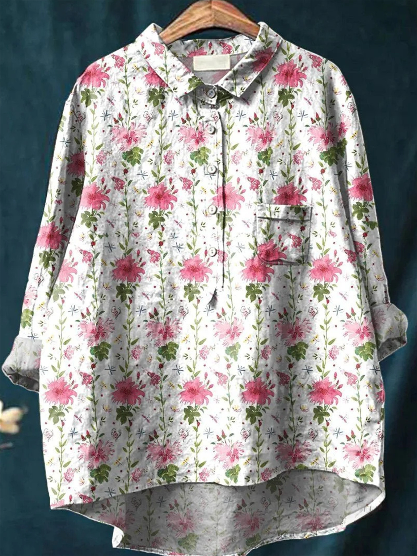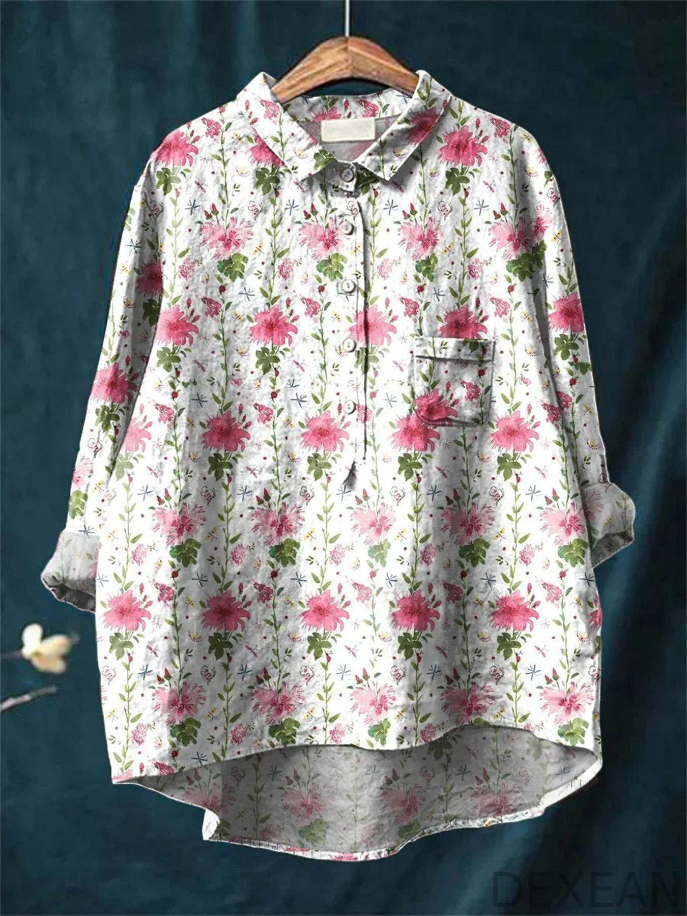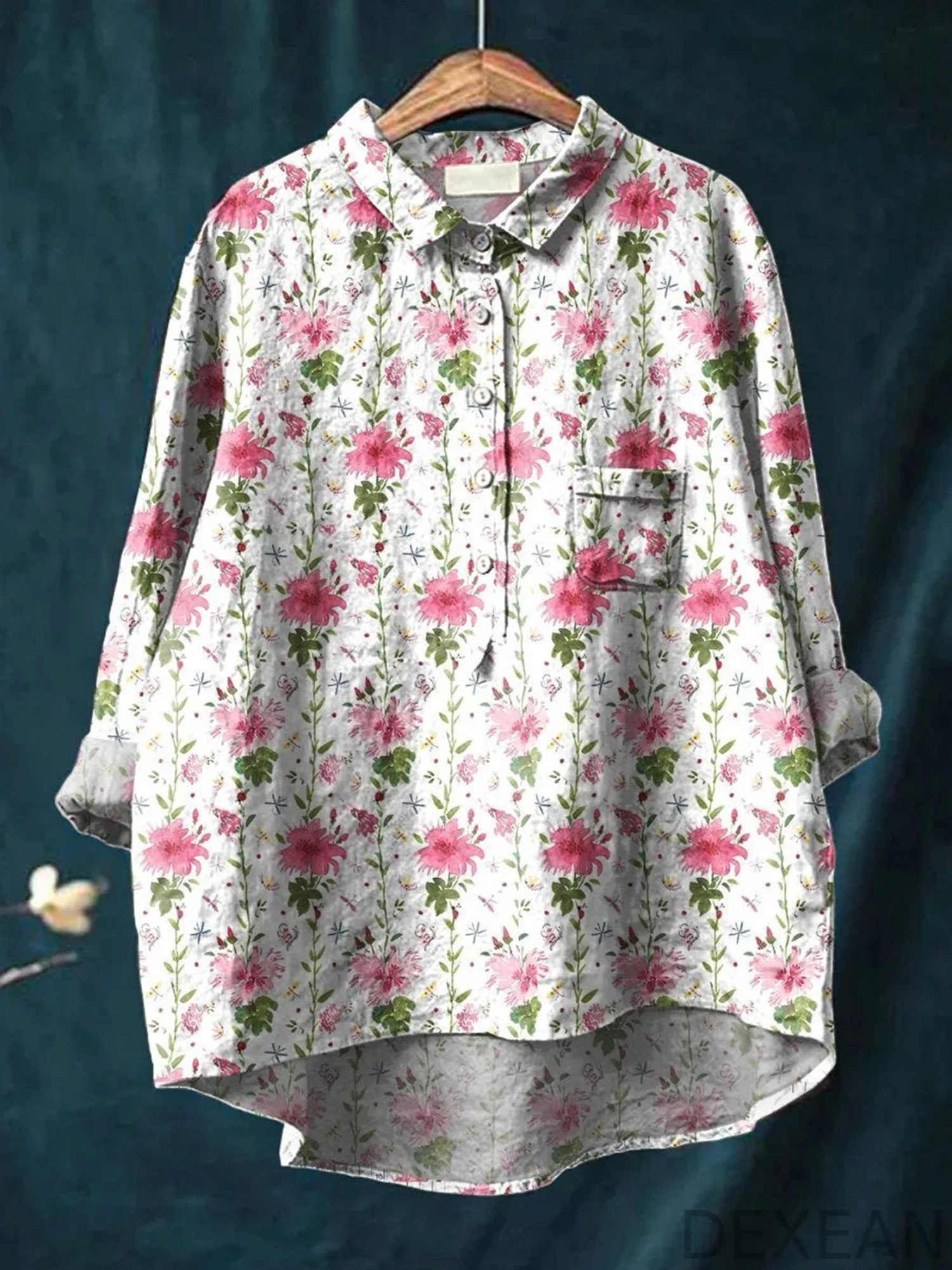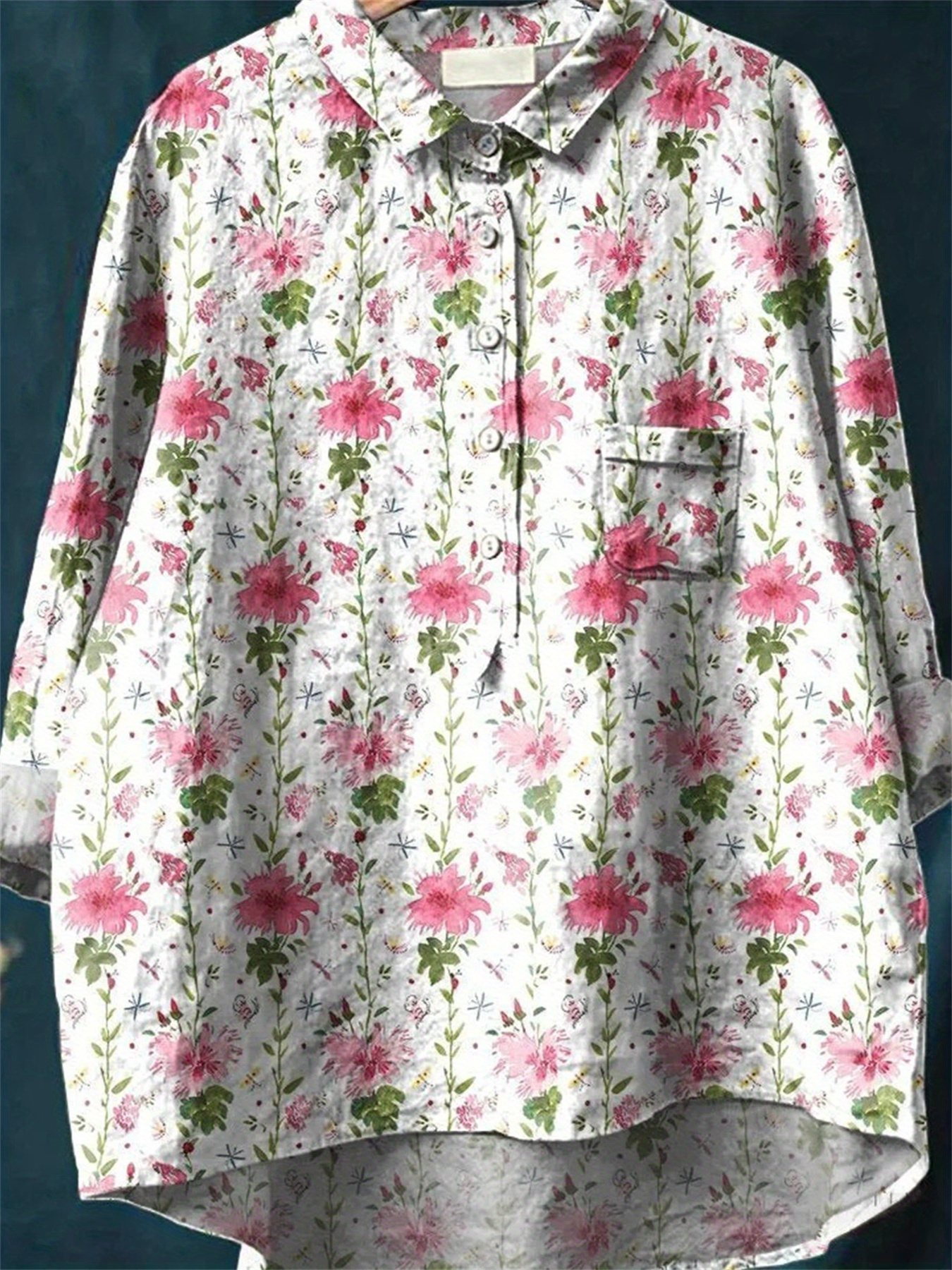 Women's Large Size Elegant Floral Print Blouse - Oversized Loose Fit Long Sleeve Shirt Jacket-like Collar, Lightweight Breathable Non-Sheer Fabric (Pink/Green/White/Grey/Brown) All-Season Office & Casual Wear with Chest Pocket -