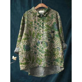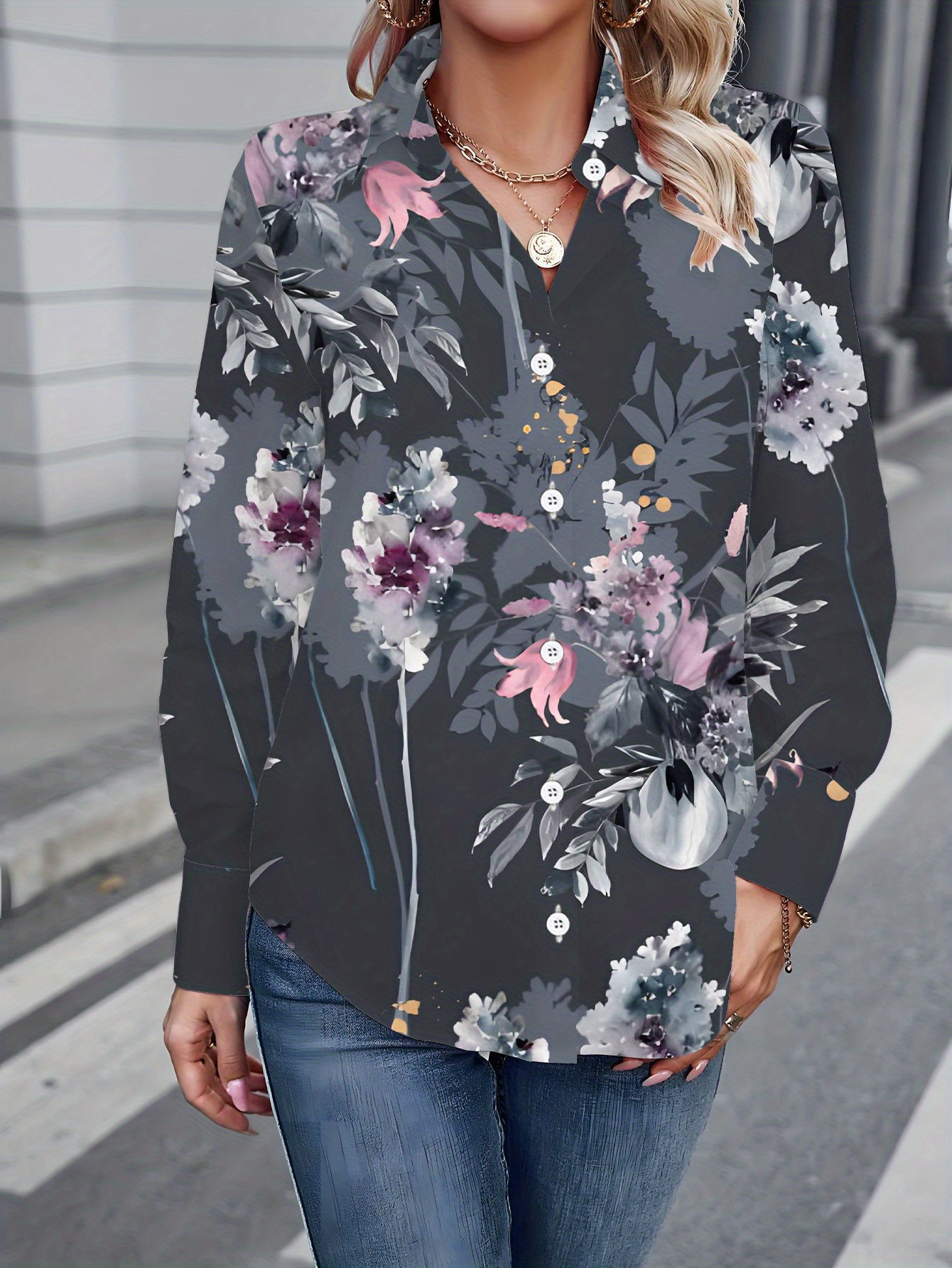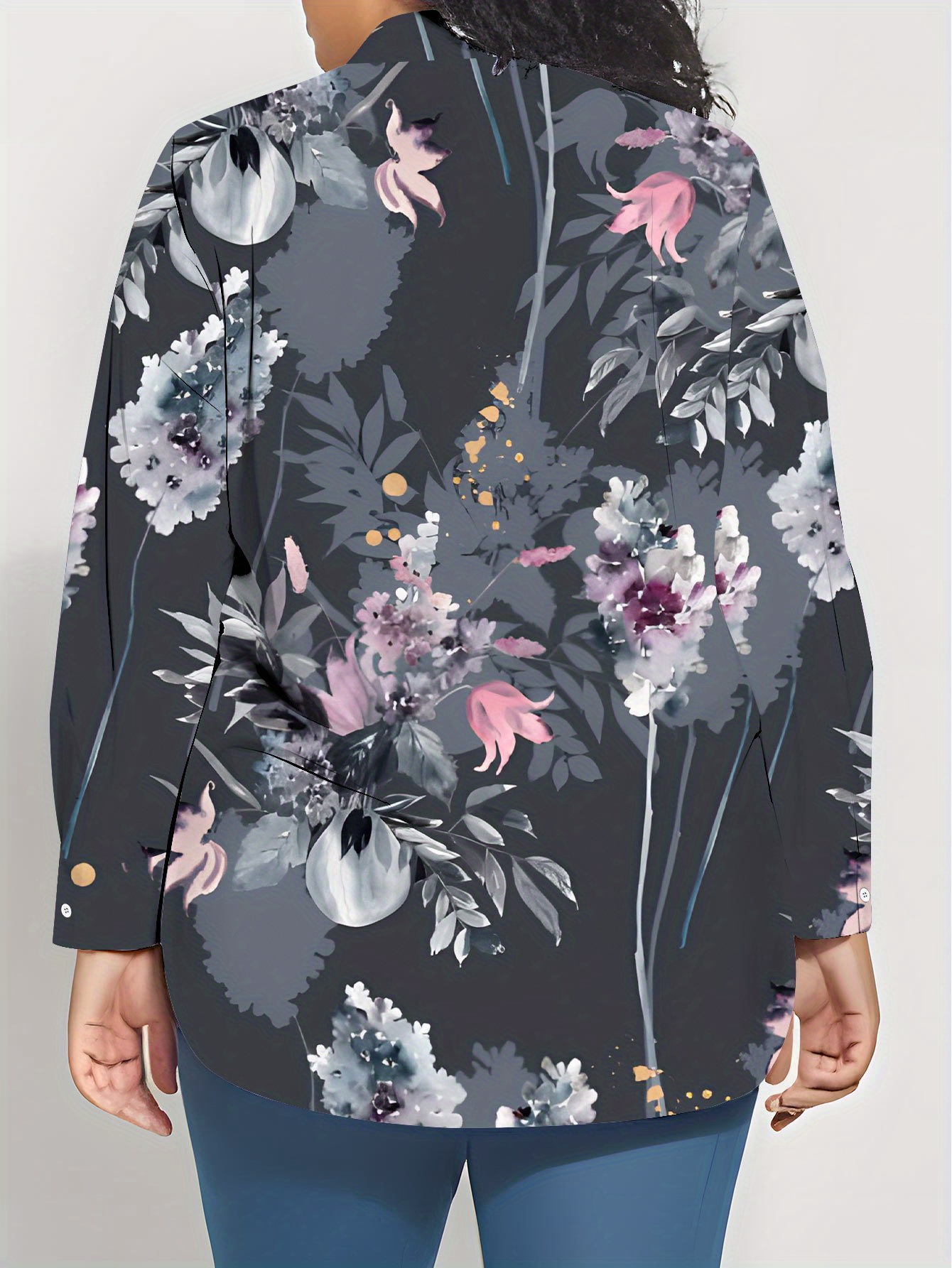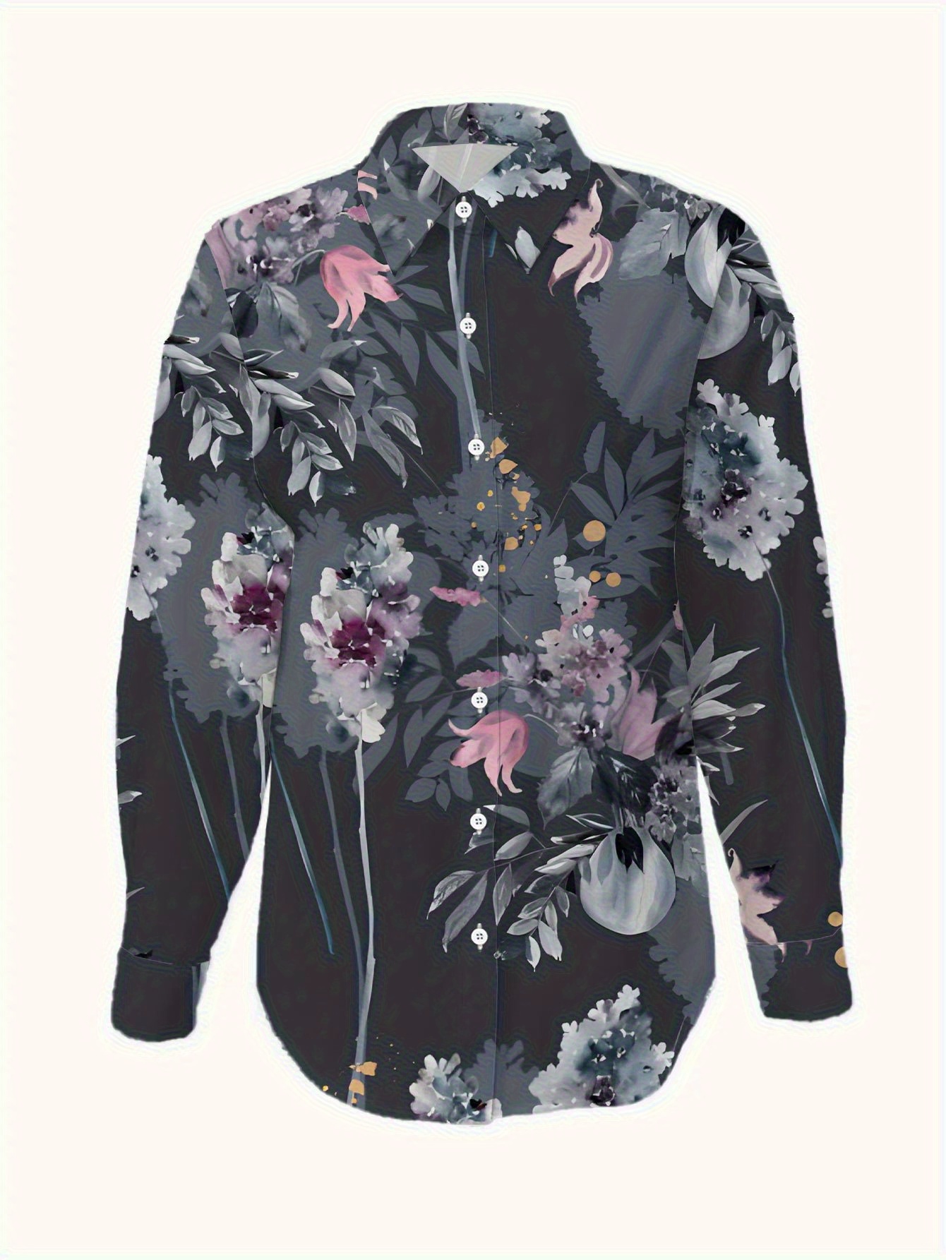 Women'S Plus-Size Elegant Asian-Inspired Floral Print Long-Sleeve Lapel Collar Blouse - Soft Breathable Fabric, Waist-Cinching & Button-Up Top with Umbrella Hem, All-Season Casual & Formal Shirt in Deep Gray Tones (Pink/White/Black) - Perfect Christ