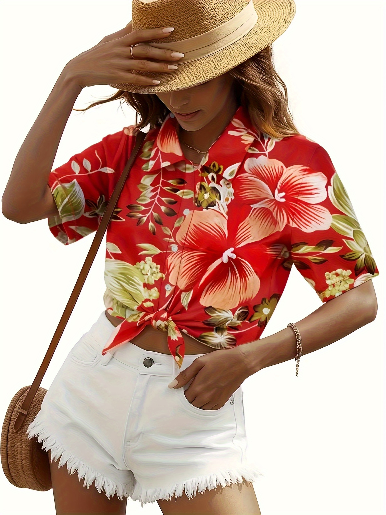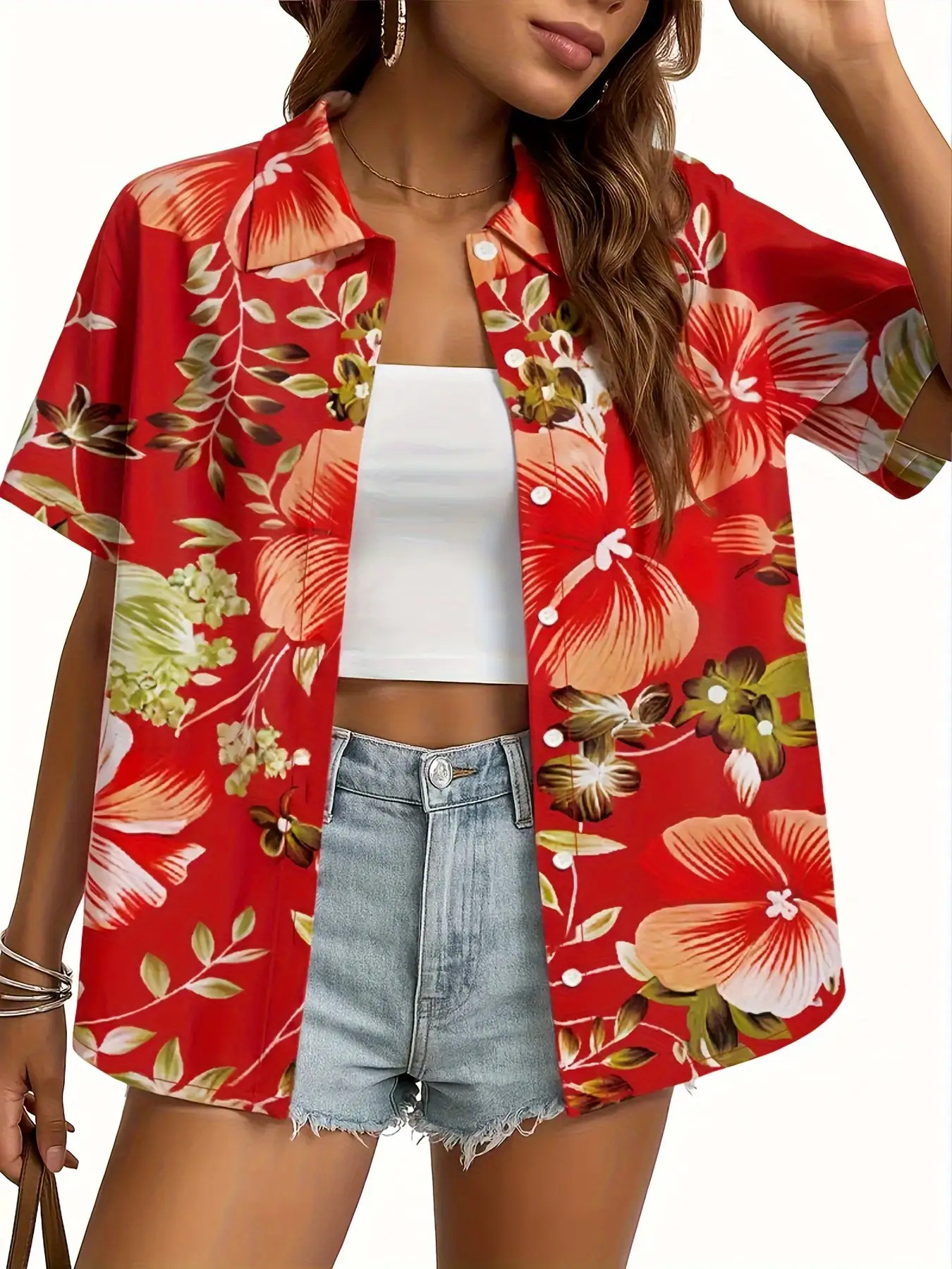 Women'S Tropical Floral Print Short Sleeve Button-Front Shirt - Vibrant Red with Orange, Green & White Hibiscus Flowers, Classic Collar, Machine Washable All-Season Casual & Hawaiian Style Blouse for Beach Outfits, Hawaiian Parties