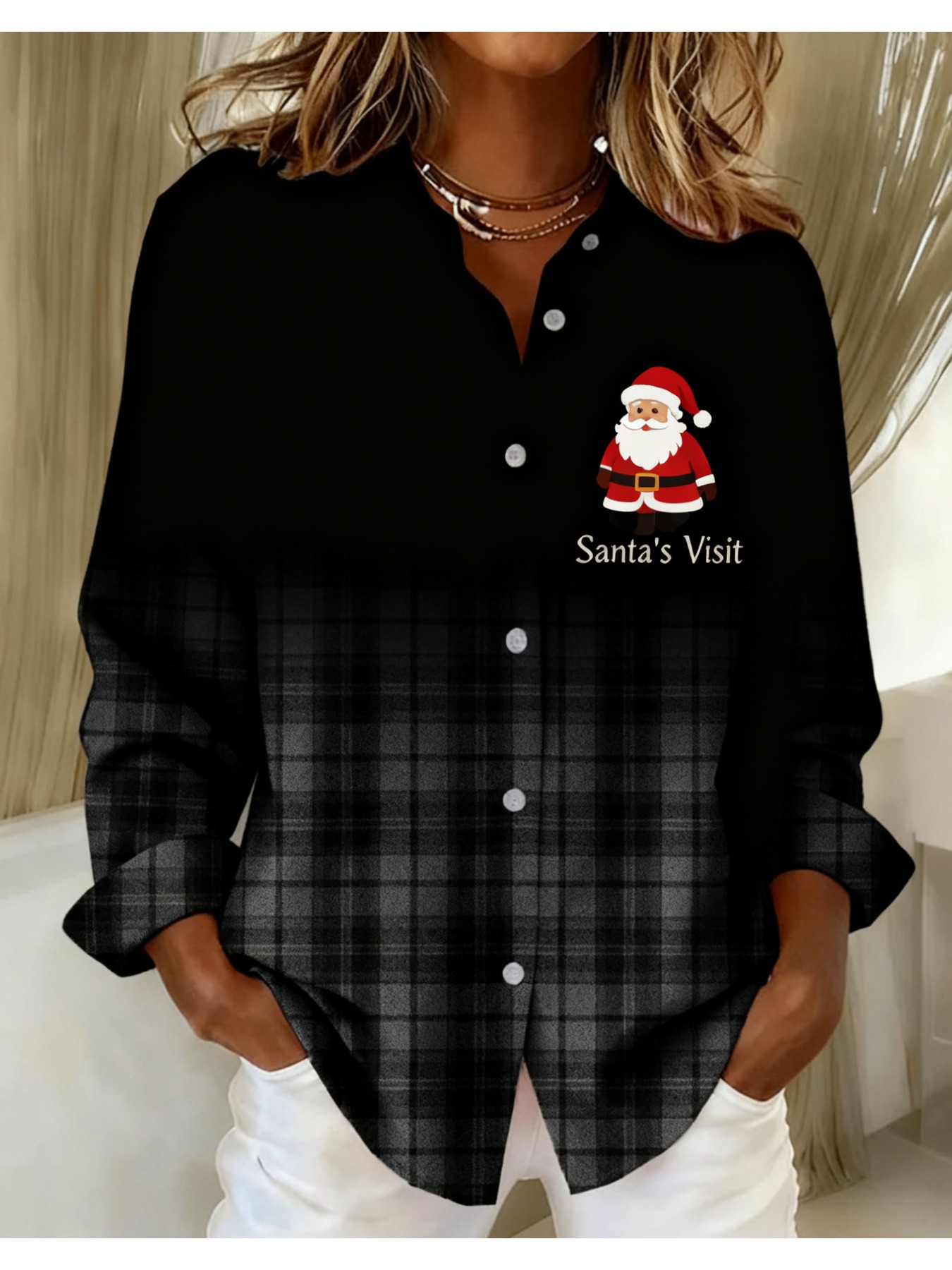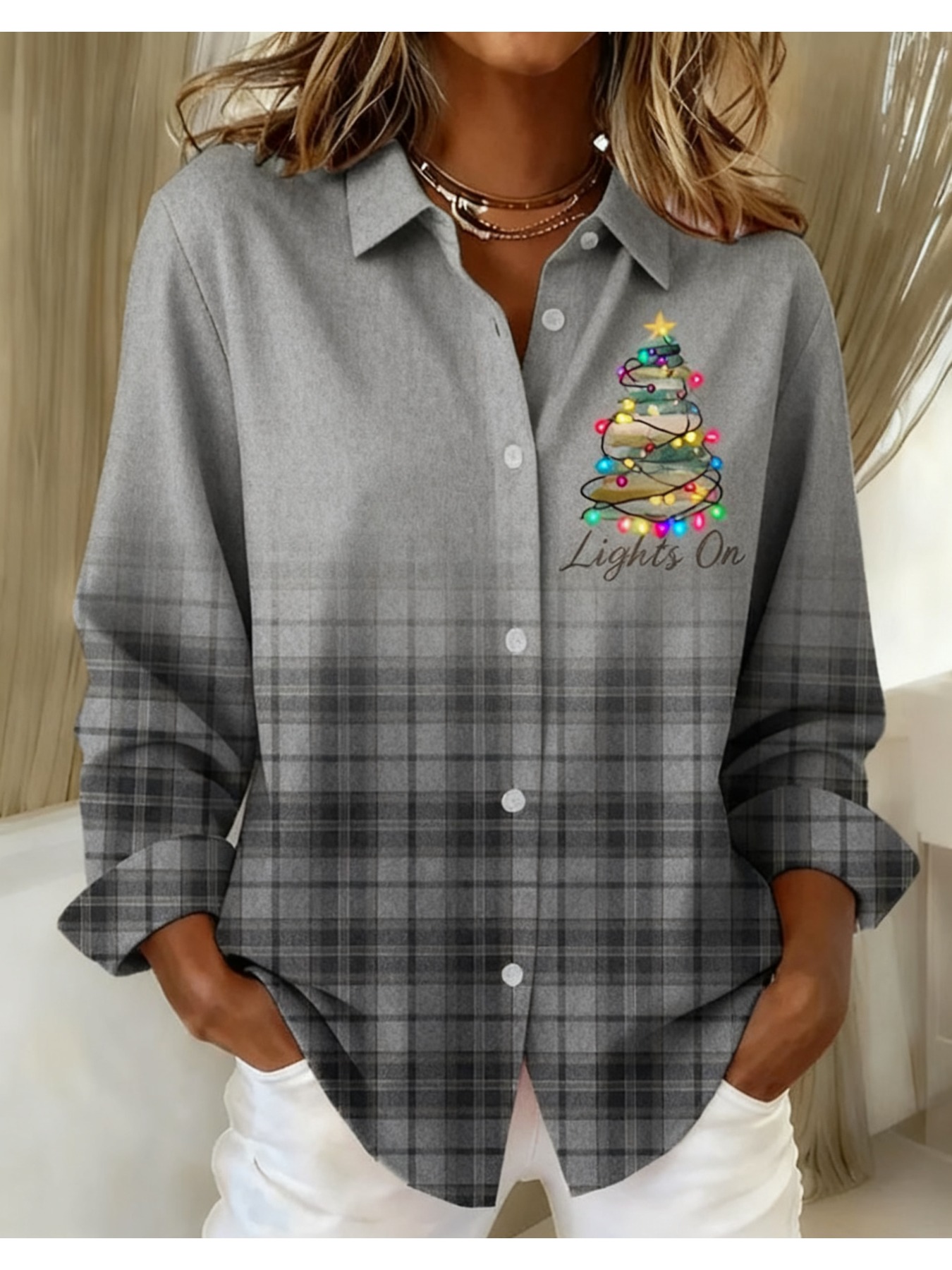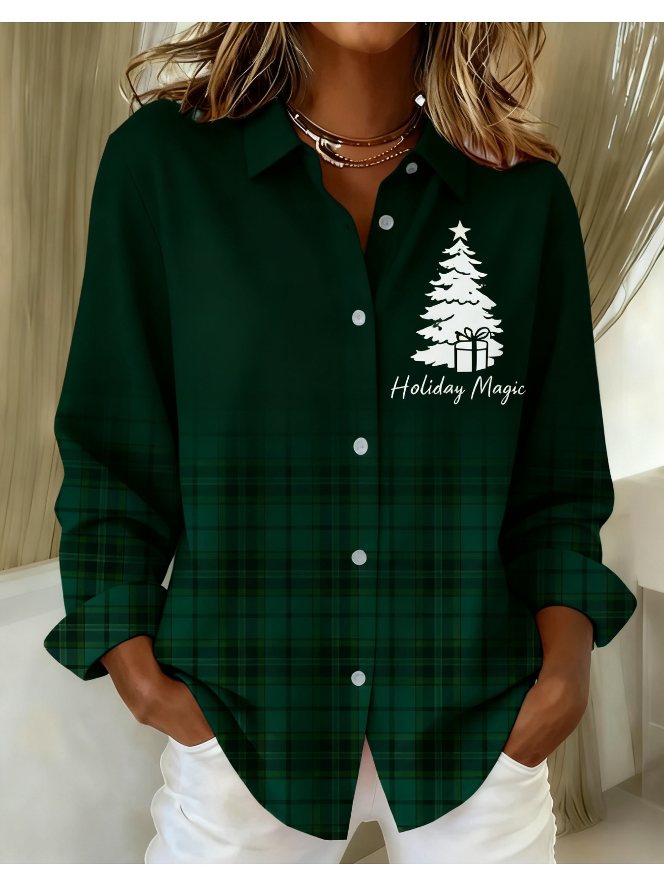 Women's Vintage Plaid Button- Shirt - Ruffle Collar Blouse, Loose Fit Casual Long Sleeve Top with Plaid Patterns (///Navy), Machine Washable for Autumn Winter Office & Casual Attire