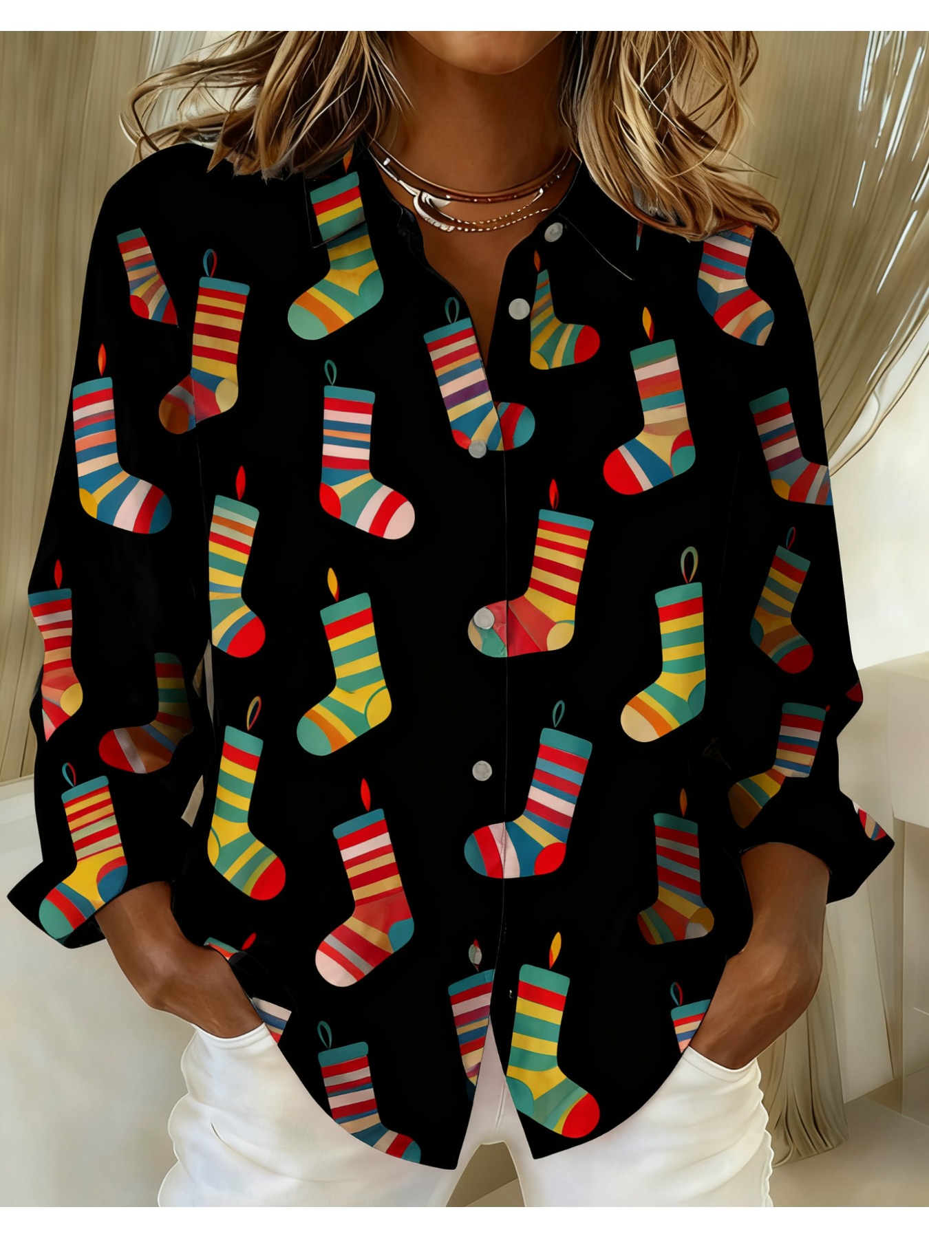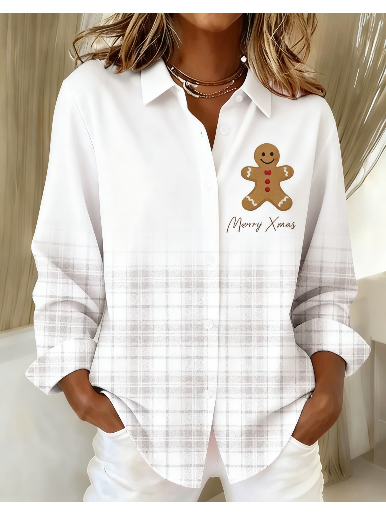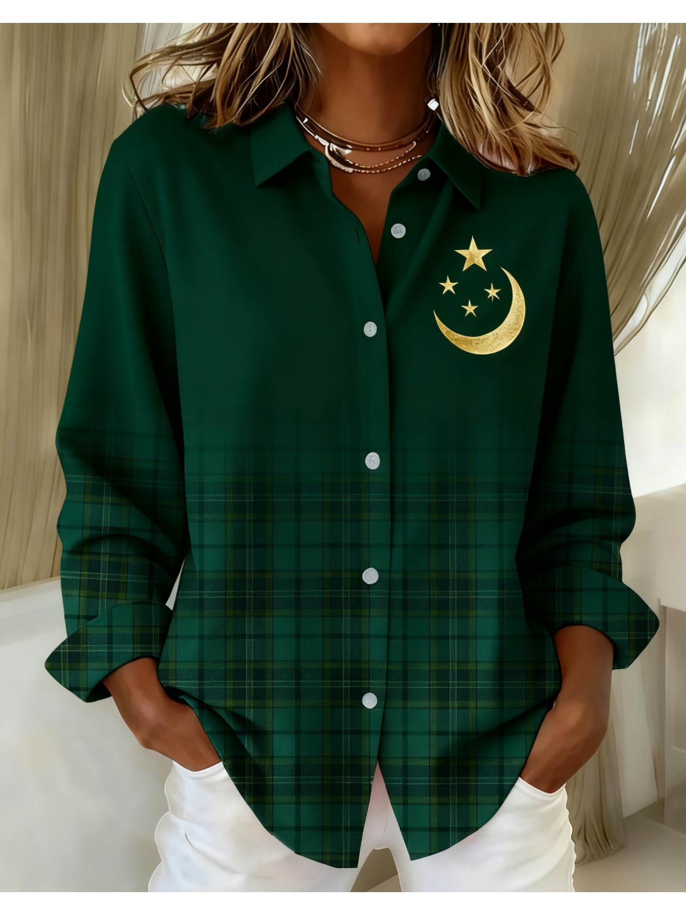 Women's Vintage Plaid Button- Shirt - Ruffle Collar Blouse, Loose Fit Casual Long Sleeve Top with Plaid Patterns (///Navy), Machine Washable for Autumn Winter Office & Casual Attire