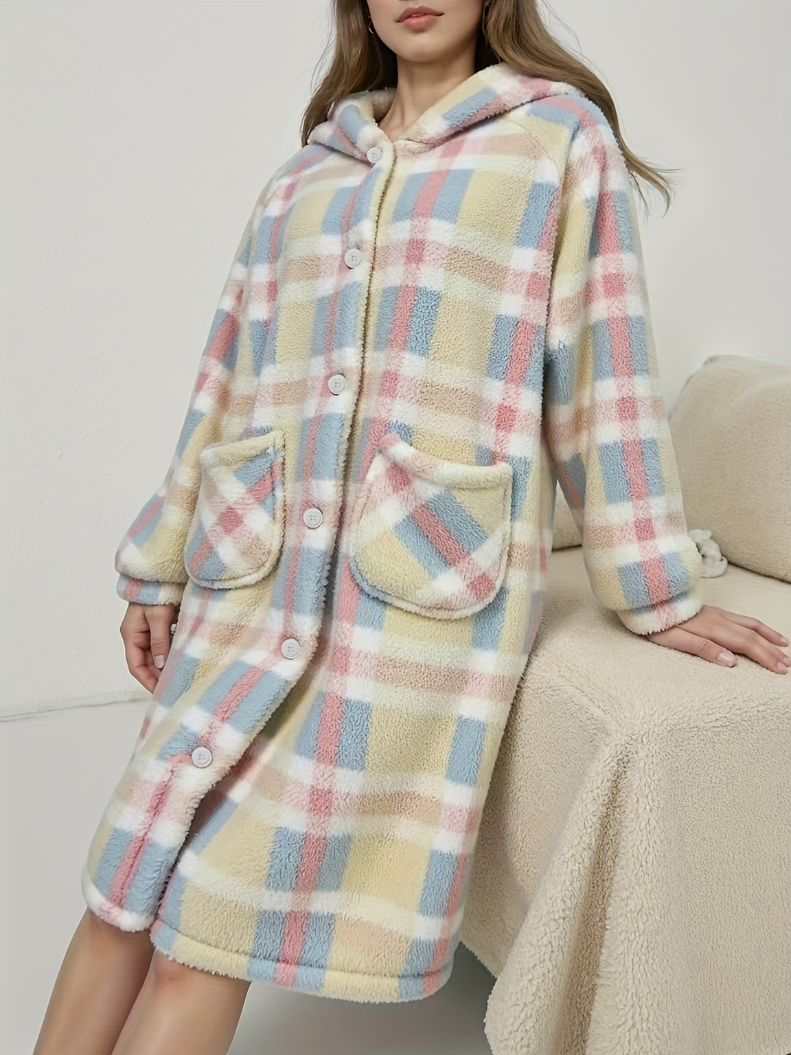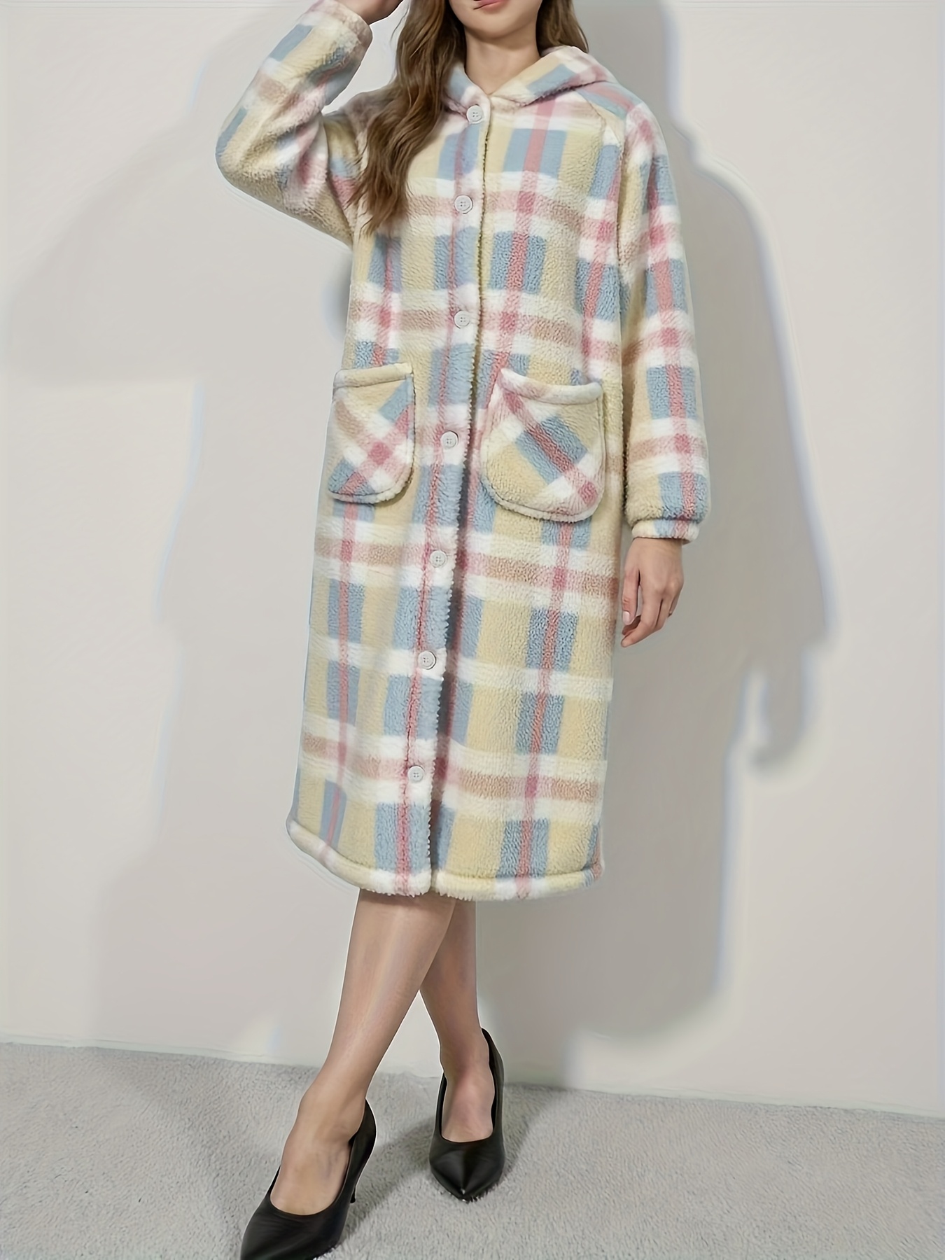Women'S Heavyweight Fleece Hooded Coat with Plaid Pattern (Pink/) - Thick Winter Warmth, Full-Zip Front Closure, Long Length for Outdoor & Indoor Use, Cozy Insulated Jacket with Pockets, Elegant Cold Weather Outerwear, Winter Coats for Women
