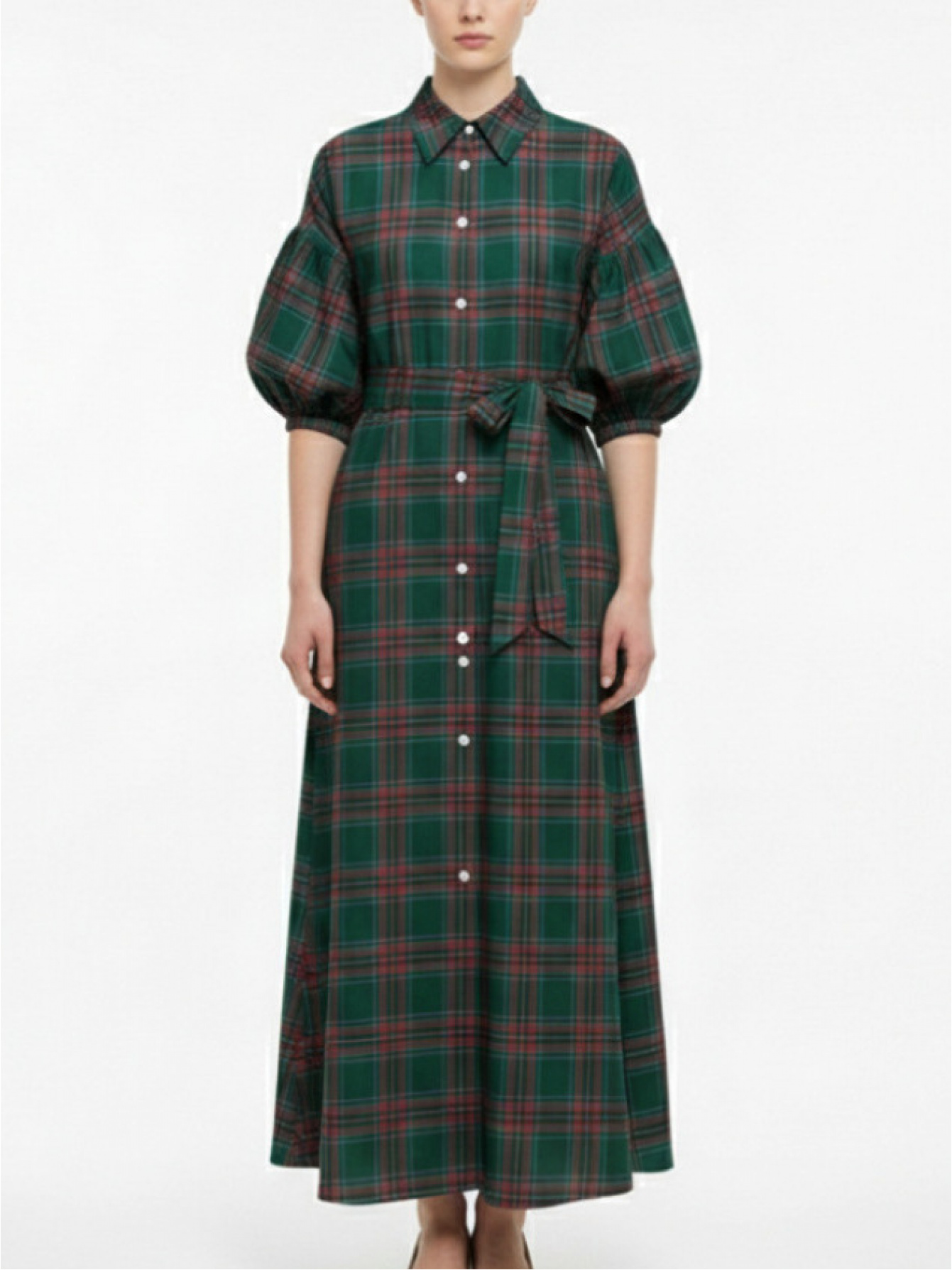 Women'S New Christmas Elements Green Red Plaid Long Casual Fashion Shirt Dress | Three Quarter Length Sleeve, V-neck, Vintage Style, All-season Wear
