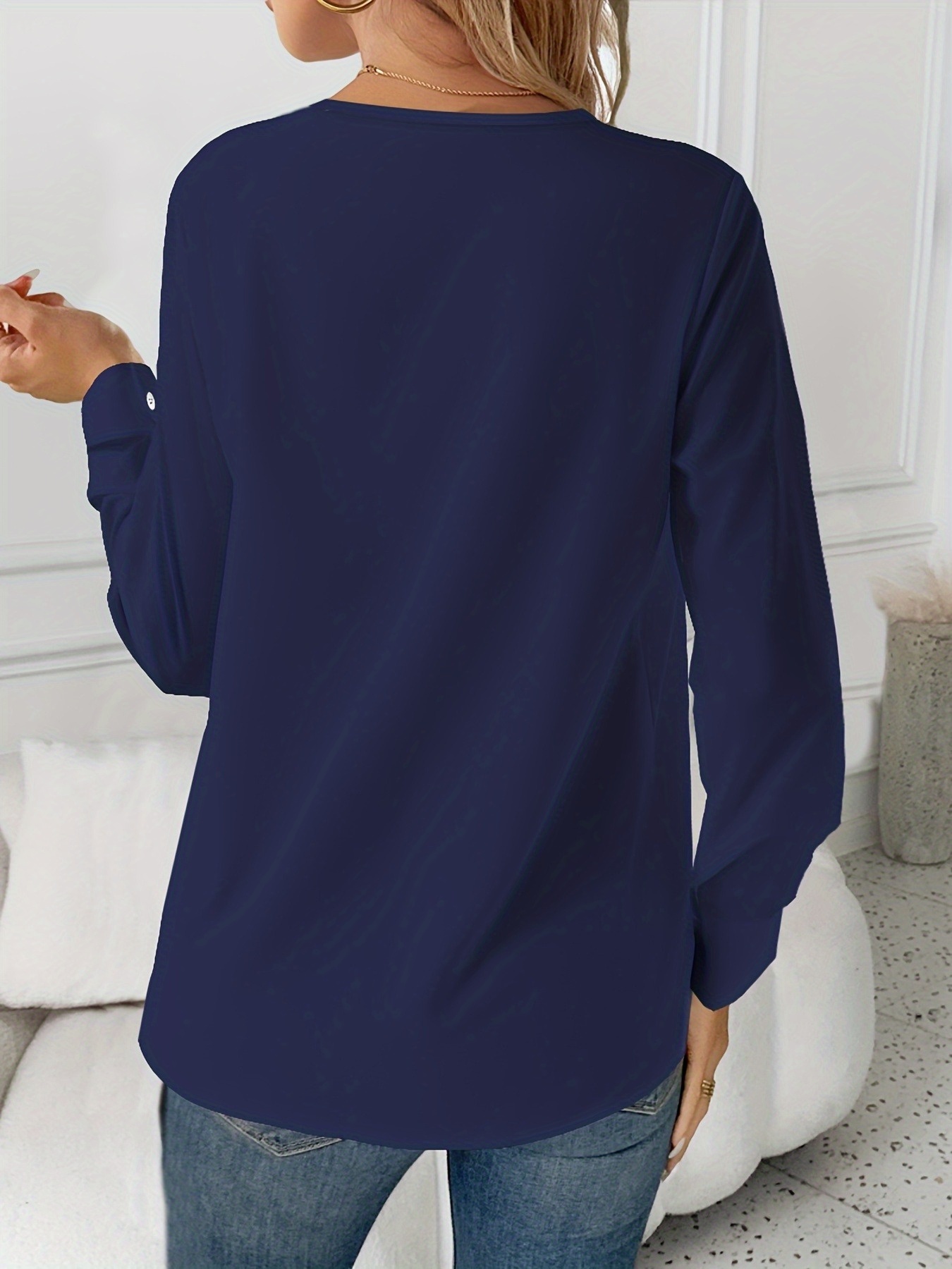 Women'S Elegant Long Sleeve Blouse - Solid Navy Round Neck Loose Fit Shirt with Piping Trim, Structured Collar & Button Front Closure, All-Season Casual to Formal Tops for Office, Semi-Formal & Casual Attire - Versatile Women'S Clothing