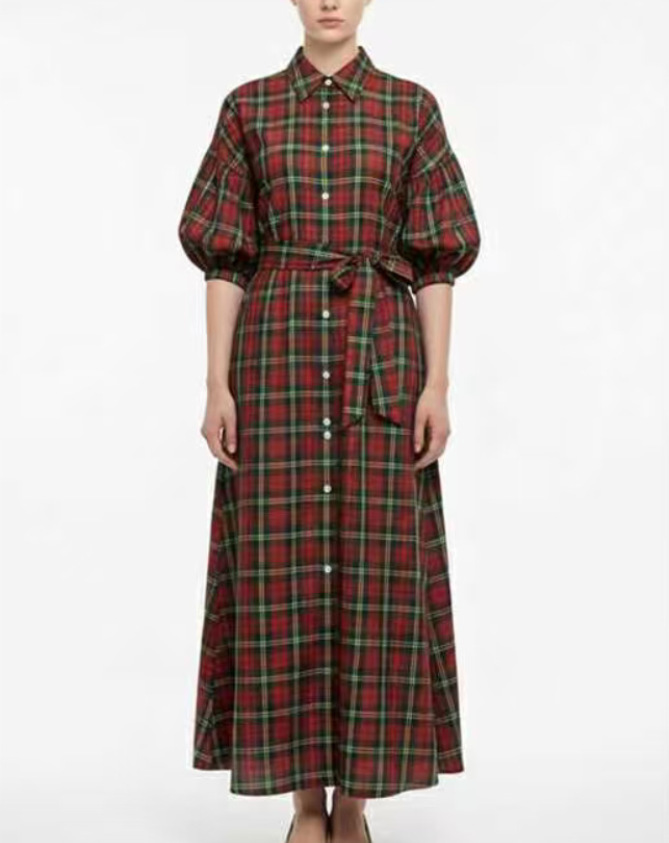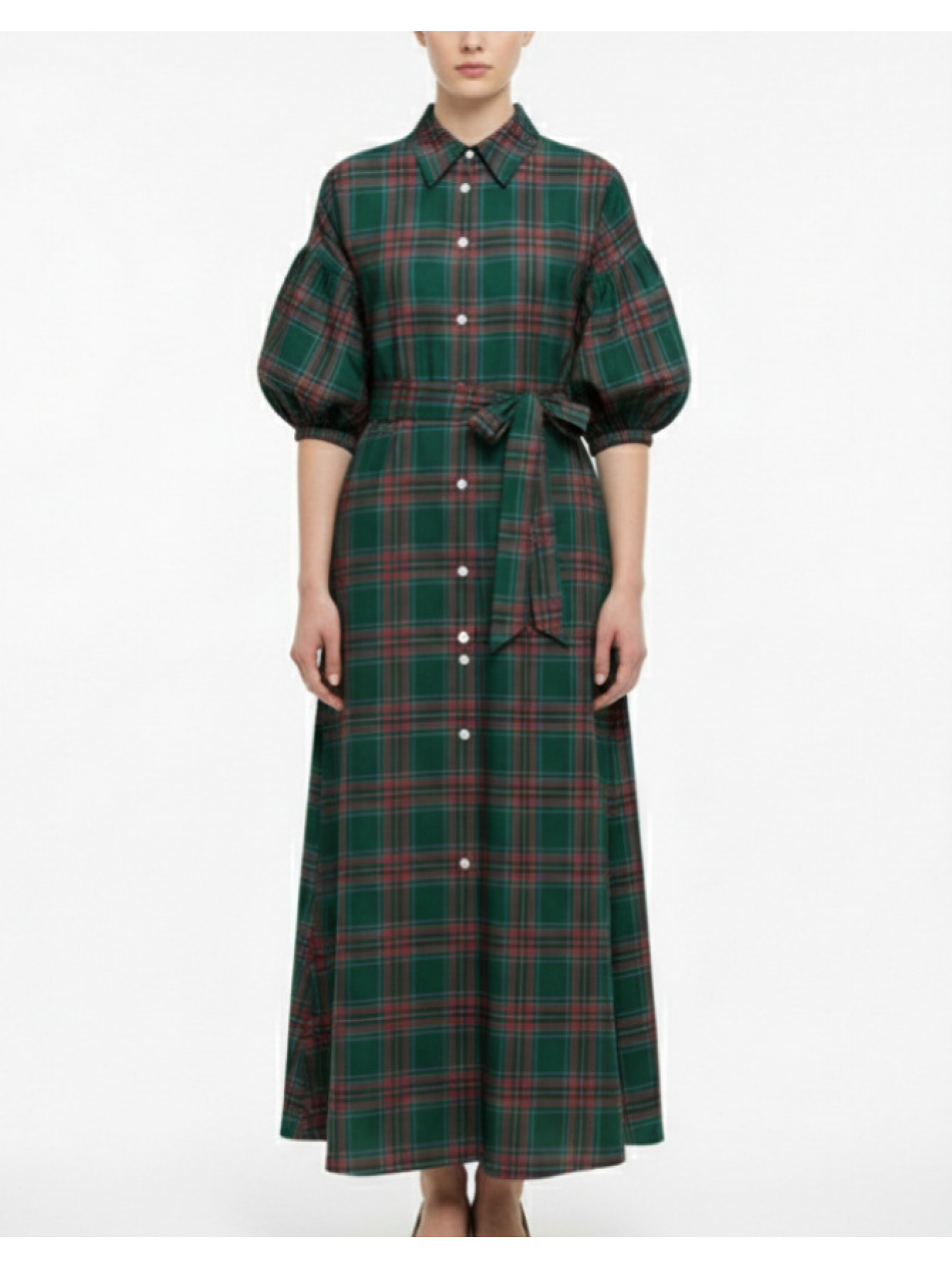 Women'S New Christmas Elements Green Red Plaid Long Casual Fashion Shirt Dress | Three Quarter Length Sleeve, V-neck, Vintage Style, All-season Wear